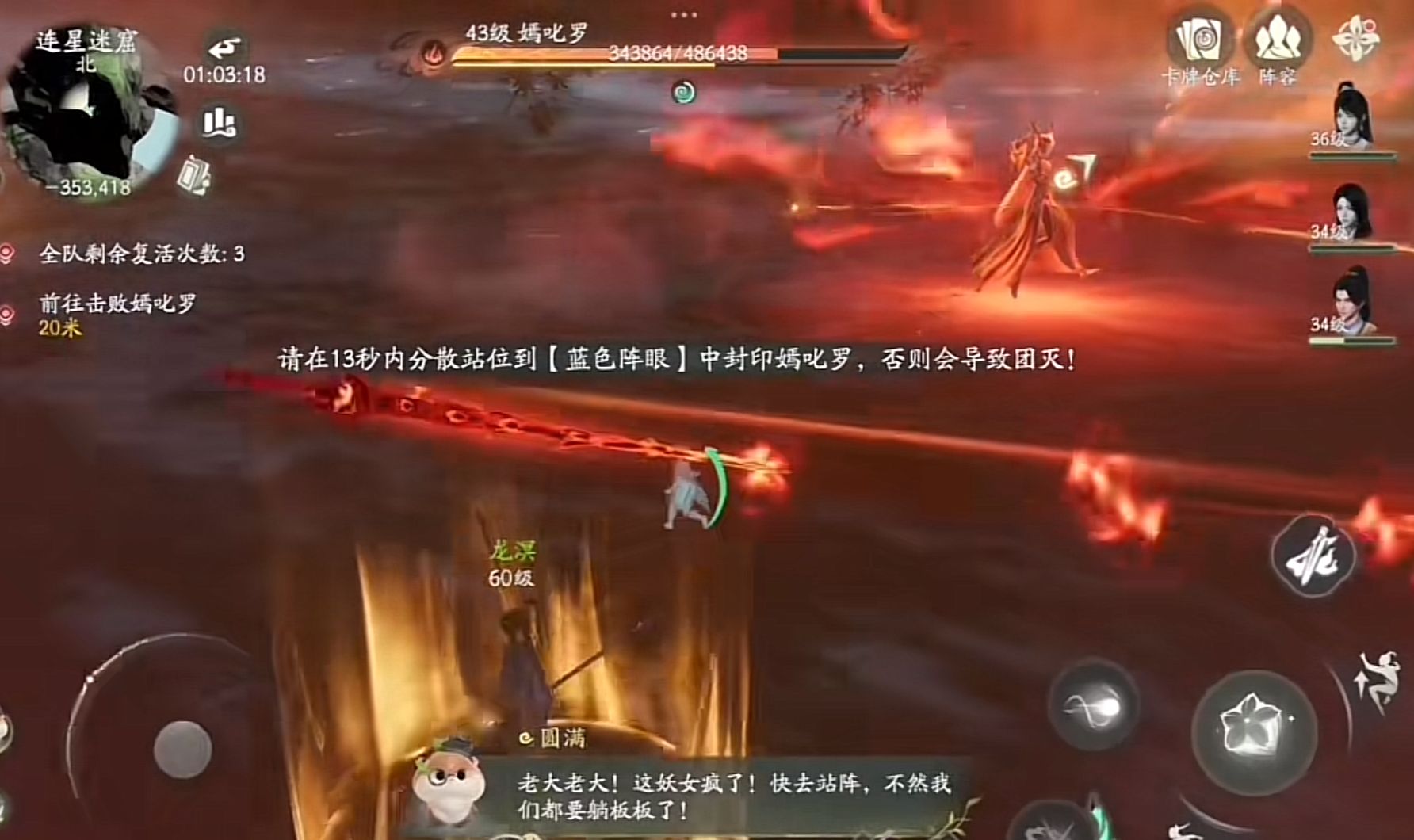 打嫣叱罗必须团队攻击,五个人组团里面必须有水属性角色,她会有俩波攻击,血量降到一半的时候开启第二个形态攻击,速度和伤害明显提升,躲开冲击波一人一个位置封印她,破除封印后继续攻击直到杀灭。