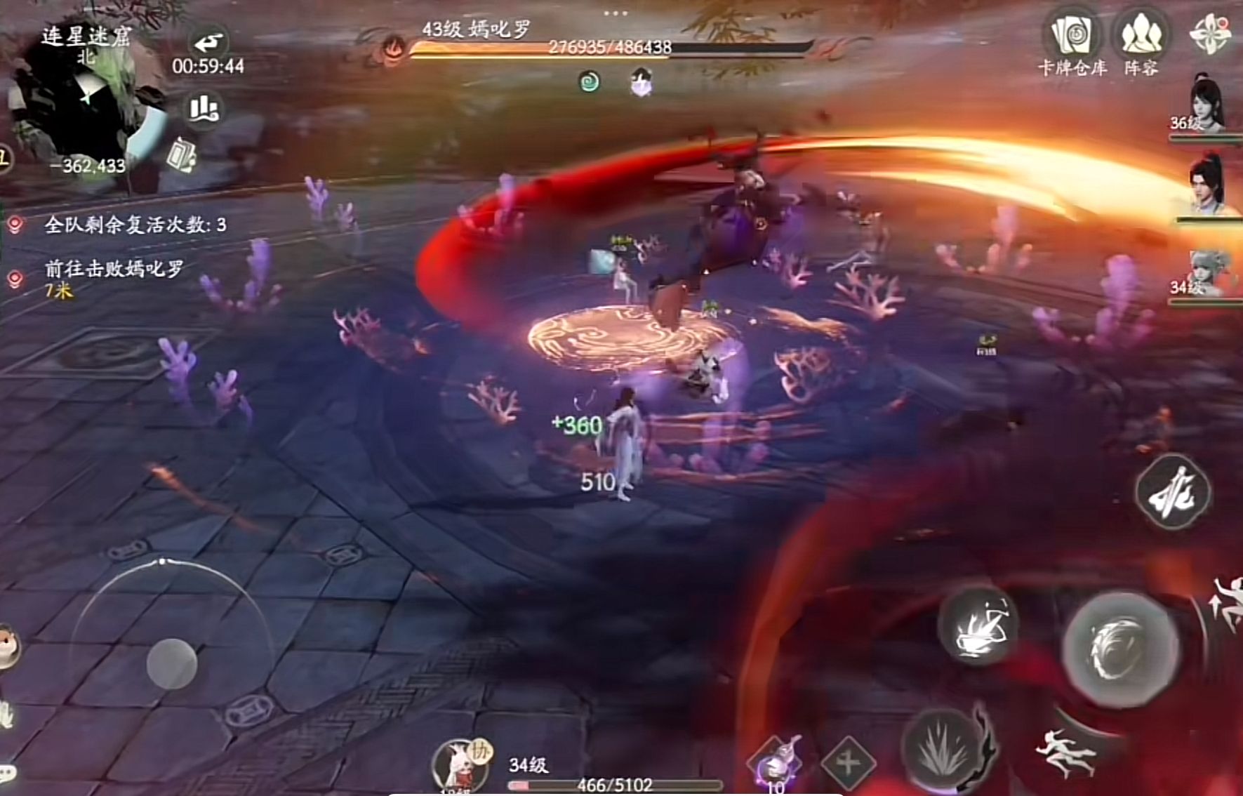 血量减半的时候迎来第二个形态,它从花中重生,天上的剑可能会一次性掉落俩把,这样我们要避开的冲击波也变成了俩次,最好在冲击波交合的地方跳跃,这样我们就只有躲避一次,同时地上可能会开彼岸花,会让我们产生眩晕不能动持续性掉血,如果躲不开就只能靠水属性队友解救,我们攻击规律就是冲击波过了就立马攻击,大家相互配合,还是能把血量耗完的。