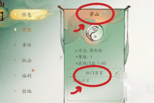 1、进入仙门界面,打开管理选择即可看到改名入口。