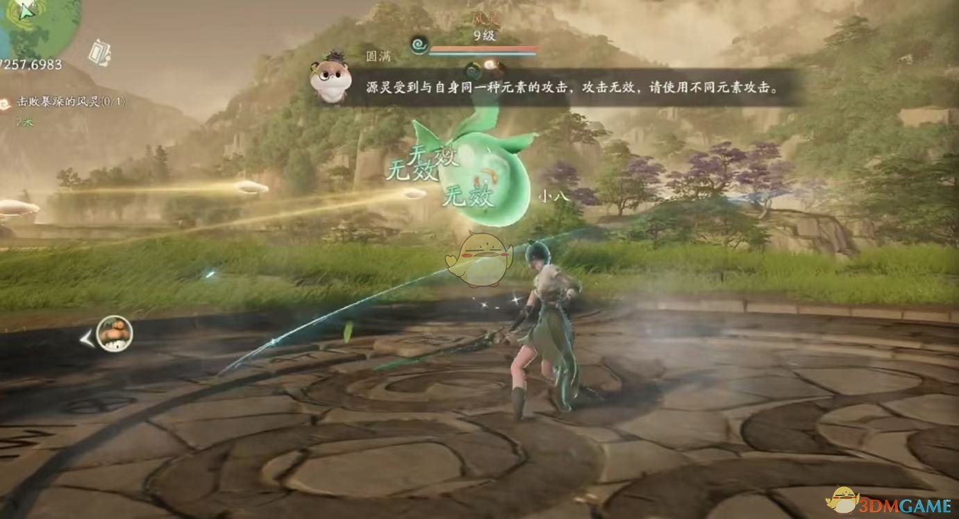 1、过主线的时候我们遇到的第一关就是对决风灵,由于这个妖怪跟主角的属性一样,所以如果不看剧情的话机会陷入主角无论怎么打风灵都不会掉血的情况,这里的要点就是要学会切人攻击,用不同的元素进行输出,由于这还是第一章节,所以难度不会太高,不用打五灵诧变也能轻松过关。