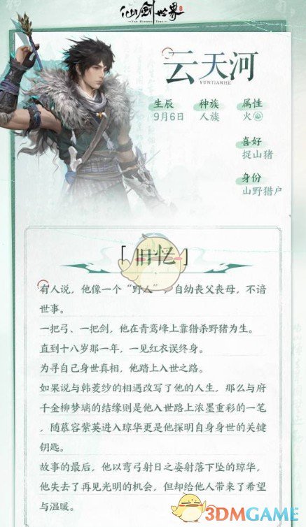 云天河本身是青鸾峰上靠猎杀野猪为生的少年,自幼丧父丧母,和韩菱纱相遇之后,改写了自己的人生,与柳梦璃、韩菱纱等一起谱写了一段段可歌可泣的故事。云天河外执神器,内修仙功,实力非常强大。仙剑世界中的云天河是属于火属性的输出型角色,在实战中的输出非常暴力。