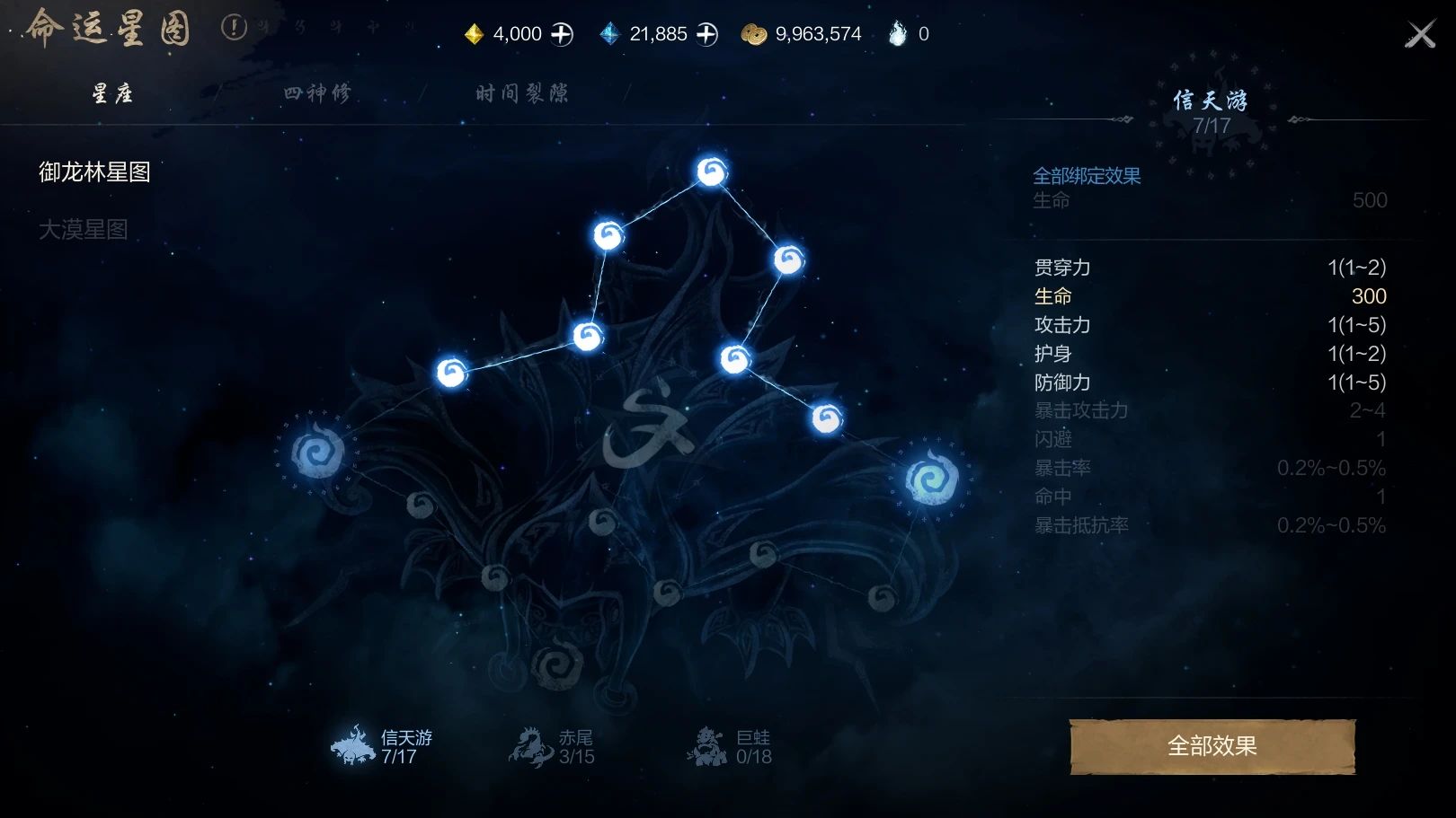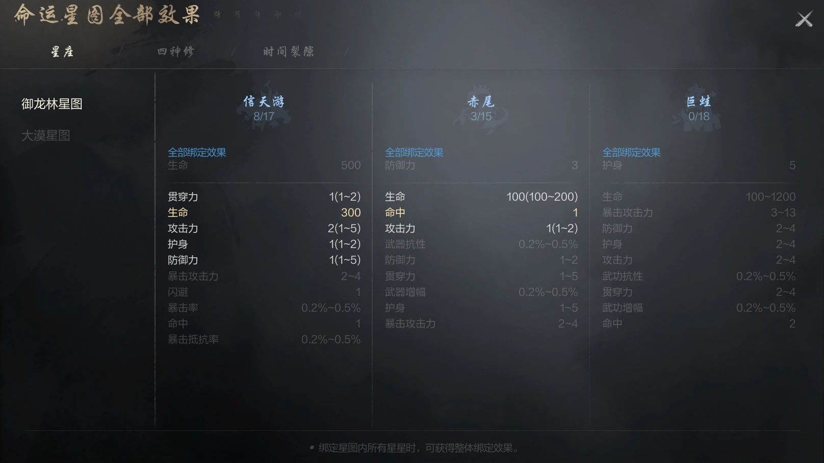 命运星图中有多个板块可以点亮,前期只能点亮星图中的-御龙林星图,御龙林星图又可分为信天游、赤尾以及巨蛙三个小星图。