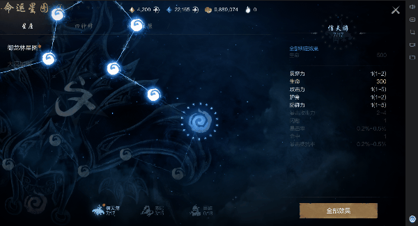 每一个星图在点亮过程中,都会给角色增加对应的能力值,且当一个星图中的所有节点都被点亮时,还会激活额外的刻印效果。