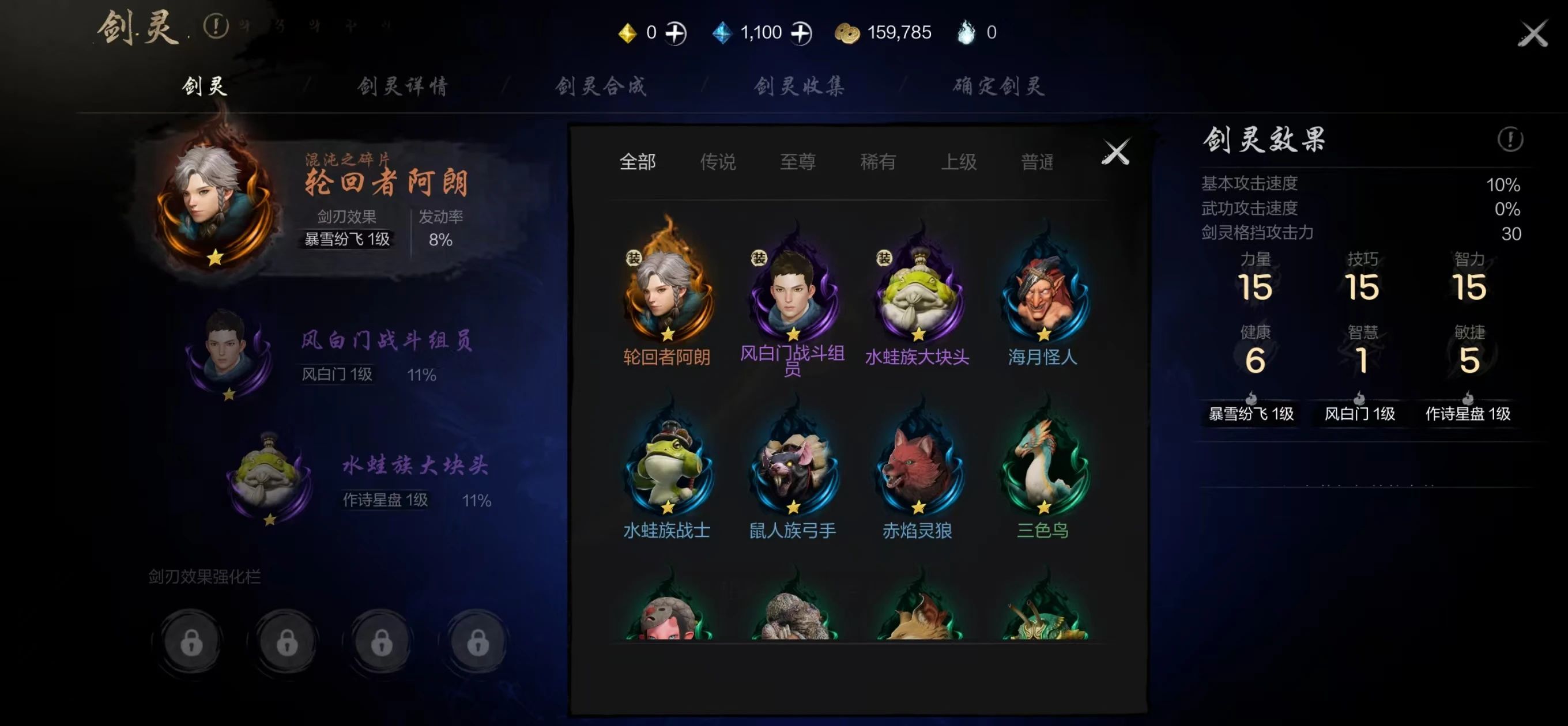 剑灵从品质从高到低可分为传说(粉色)、至尊(橙色)、稀有(紫色)、上级(蓝色)和普通(绿色)五种品质。