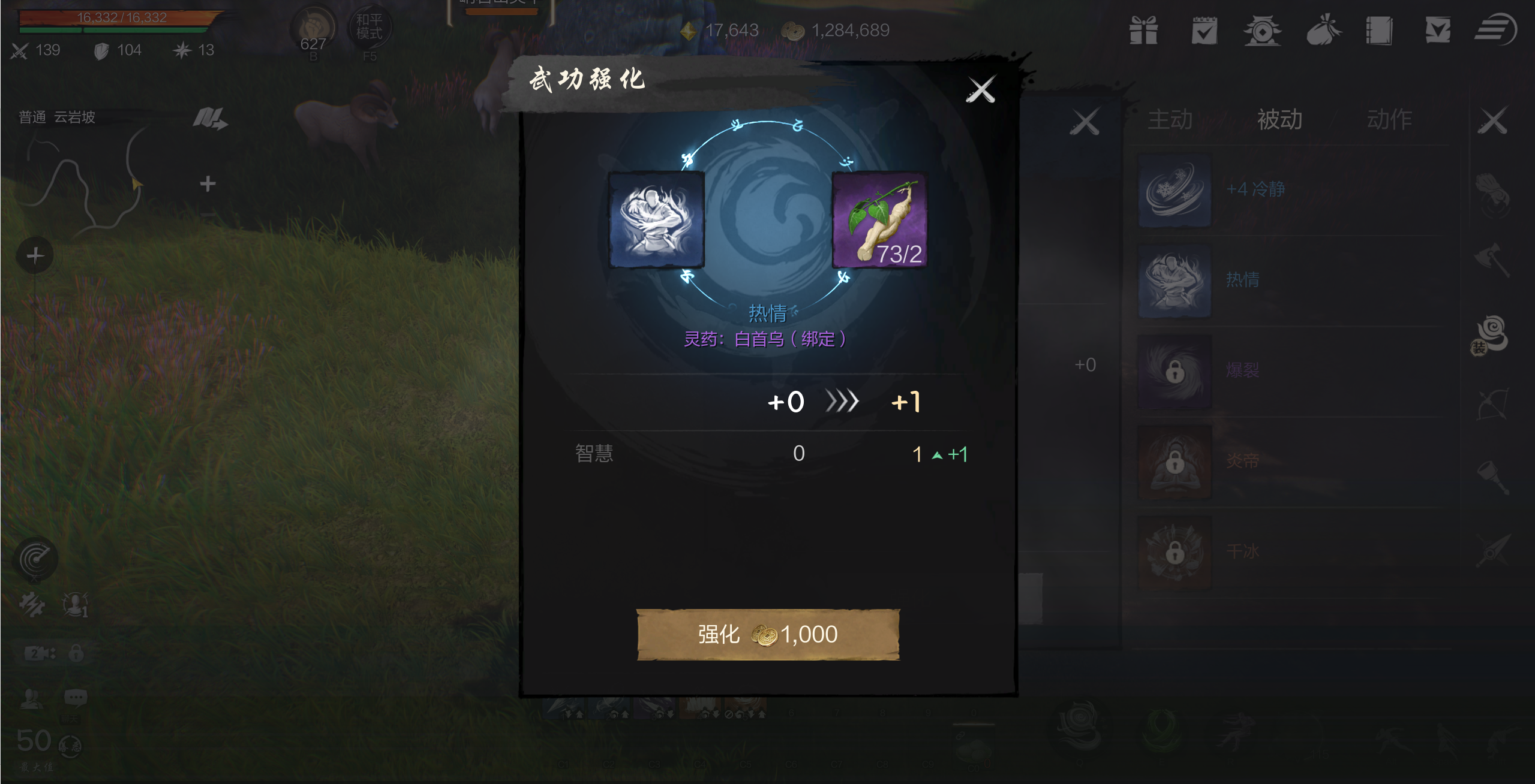 强化被动武功可以提升武功对角色的属性加成和效果加成,建议从高到低进行强化,优先强化【冷静】来提升智力属性,增加彩绫的基础输出能力。