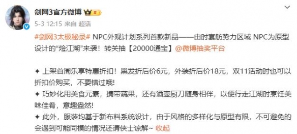 1、全新NPC套【烩江湖】为商城常驻套装,首周为折扣价,售价18元;