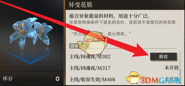 答:完成主线/回魂夜/M302即可领取异变花簇。