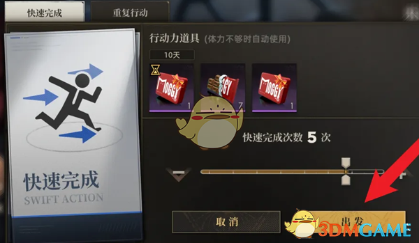 3、在快速完成页面,点击右下角的出发,消耗材料即可快速完成关卡;