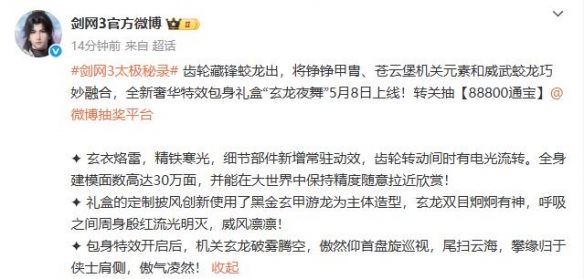 1、时装【玄龙夜舞】为全新的奢华特效包身礼盒,将于5月8日上线;