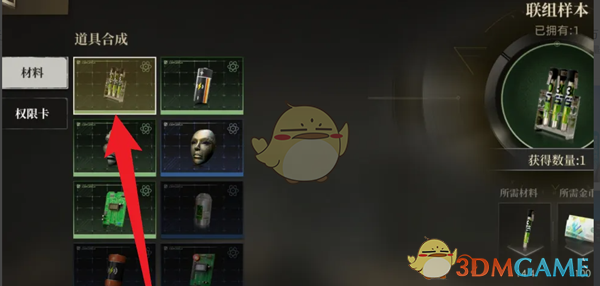 3、在道具合成页,选择左侧的材料,点击联组样本;