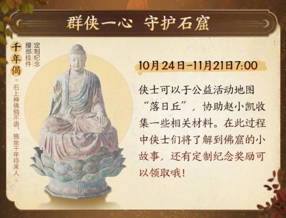 剑网3近日宣布将与敦煌石窟一起开展公益保护活动,很多玩家都想知道敦煌石窟公益活动什么时候开,活动将在2024年10月24日开启,从主城接引人【佘婵】处前往活动场景【落日丘】,接下来就由小编给大家带来了详细的《剑网3》敦煌石窟公益活动开启时间。