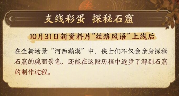参与方式:前往全新场景【河西瀚漠】亲身探秘石窟并逐步了解到石窟的制作过程。