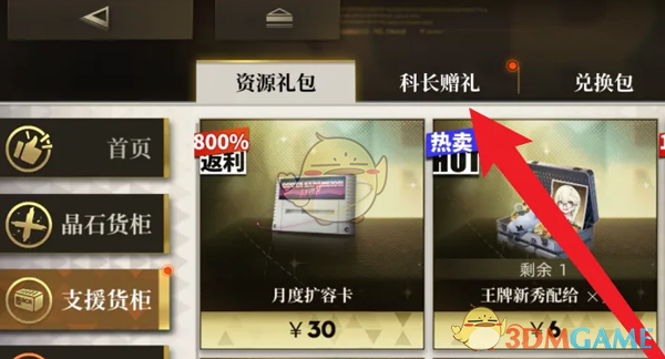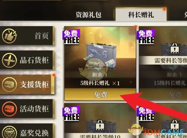 答:在支援货柜找到科长赠礼礼包完成购买即可获得礼包。