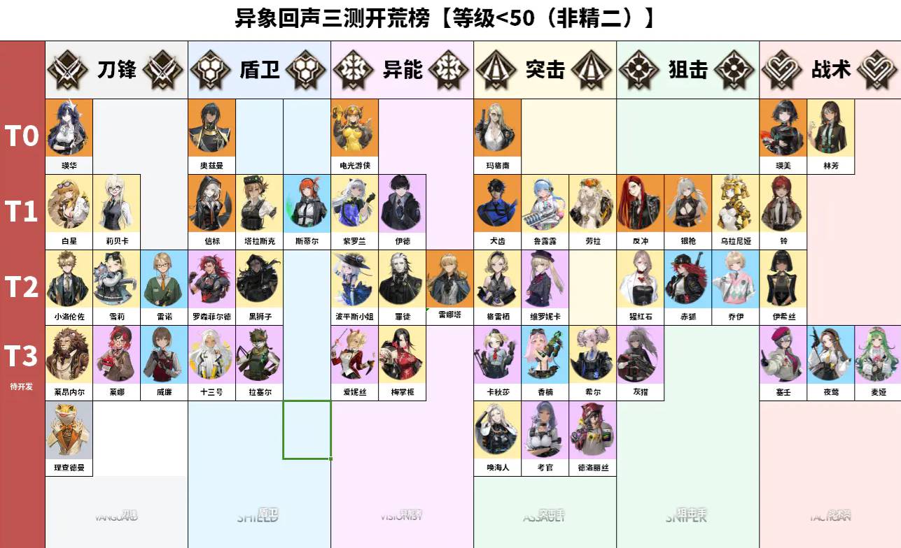 《异象回声》的节奏榜是对游戏中角色强度的排名,就是一种强度的排行榜,其中包括多个等级,如T0的超模级、T1的突出级、T2的优势明显级等。每个等级的角色都有其独特的特点和强度。我们打个比方,伊斯梅尔是T0强度的角色,可以为全体队员回复大量生命值;而伊德、雷娜塔等则是T1强度的角色,他们各自拥有不同的技能和特点。更多角色信息,建议查阅《异象回声》游戏官网。