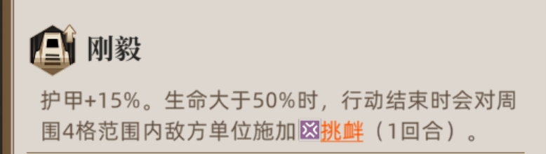 其次就是被动挑衅,这个技能就比较厉害了,在美式战棋高伤害的环境下,可以有效防止敌人一枪点掉你比较脆的输出位,同时也可以给近战切入位提供一定的转火保护。但存在三点限制,一是自己血量健康,毕竟盾卫要挨不少打而且被动有血量限制;二是挑衅的被动只是行动结束时给一个不大的范围内的一次性上buff,而不是一个持续发挥作用的特性,就会导致一些远程敌人并不会被挑衅影响;三是就是面对一些aoe时,效果也会打折扣。所以这个嘲讽也不是无脑强,比较考验站位、阵容和队友配合。