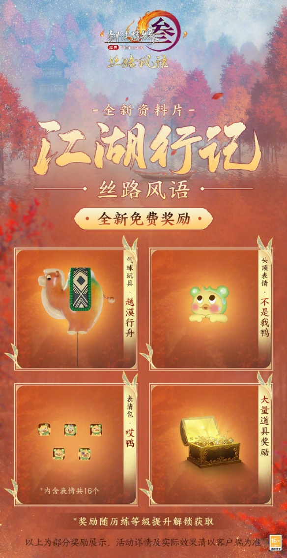 江湖行记会随着剑网3赛季更新,很多玩家想知道丝路风语江湖行记奖励有哪些,免费奖励有:气球玩具·越漠行舟、头顶表情·不是我鸭、表情包·哎鸭等等,接下来就由小编给大家带来了详细的《剑网3》丝路风语江湖行记奖励一览。