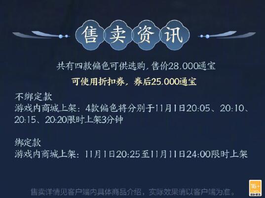 不绑定款(4款偏色):11月1日20:05、20:10、20:15、20:20限时上架3分钟