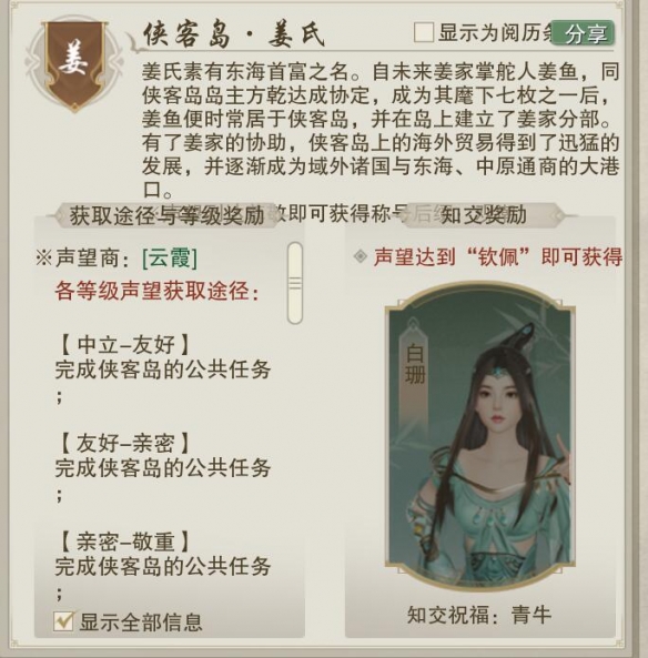 1、玩家完成侠客岛的公共任务即可提高侠客岛姜氏的声望;
