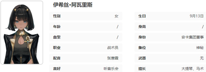 安卡集团最年轻的董事,也是安卡集团董事长奥兹曼先生的妹妹。身体孱弱,曾因不明原因陷入长时间沉睡。醒来后,伊希丝小姐时刻处于奥兹曼先生严密的保护之下,鲜少出现在公众视野。