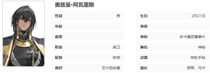 异象事件“杜阿特之门”的直接关联人。分析认为奥兹曼先生在这次异象事件中获得了某种启示,并以此为契机取代他的父亲,成为安卡集团最具野心和实力的掌事者。