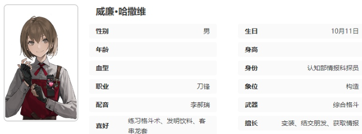 因屡次打架斗殴被高中开除,后从事过各种不同的工作,掌握了基础的变装技能并学会多种格斗技巧。被应对局认知部录用为情报探员,曾多次配合行动部与控制部下属科室执行外勤任务。
