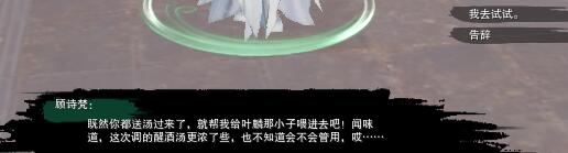 1、触发后与【叶然】对话带着【特供醒酒汤】去找四夫人【顾诗梵】;