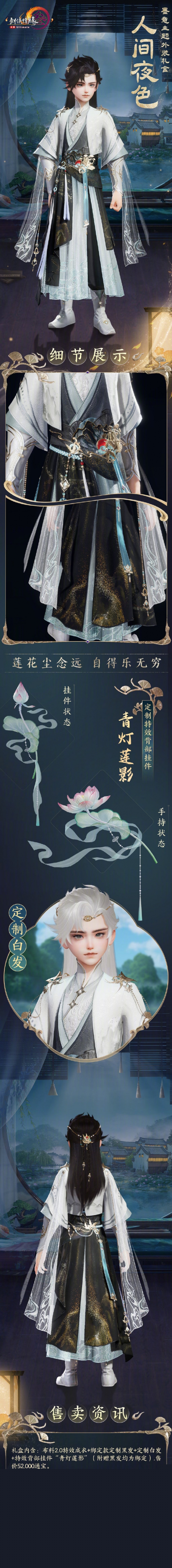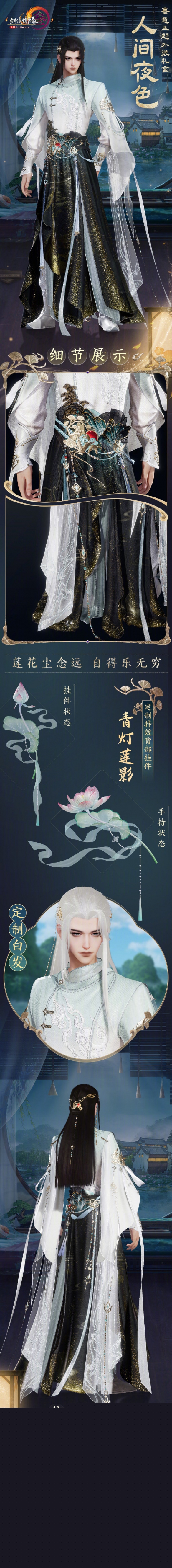 2、礼盒内含:布料2.0特效成衣+绑定款定制黑发+定制白发+特效背部挂件“青灯莲影”