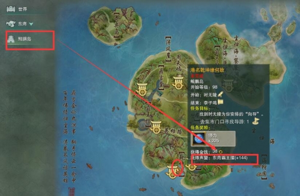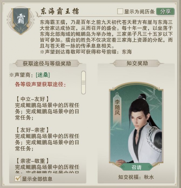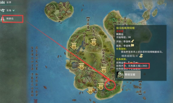1、玩家完成鲲鹏岛场景中的历程任务、日常任务即可提升东海霸王擂的声望;