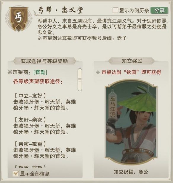 4、声望尊敬后获得称号【赤子】,知交祝福为【急公】可增加少量的体质、治疗量、会心。