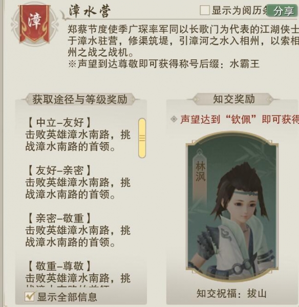 1、玩家击败英雄/挑战漳水南路的首领即可增加漳水营的声望;
