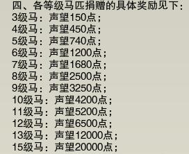 1、玩家可通过上缴任意马匹把声望提升到【友好】,之后则需要提供对应等级的马匹才能加声望;