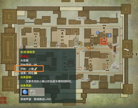 1、神行长安城去西城找NPC【小瑜】接起始任务【听雨诵相思】;