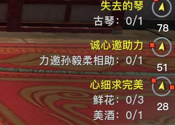 2、依次顺着顺着任务线做下去接到三个任务需要古琴、酒、鲜花和孙毅柔;