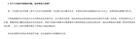 万宝楼上出售购买道具都需要手续费,很多玩家想知道万宝楼手续费多少,万宝楼账号的手续费是5%,其中1%为支付宝提现费,如遇手续费折扣活动,将以活动期间手续费比例为准,接下来就由小编给大家带来了详细的《剑网3》万宝楼手续费介绍。