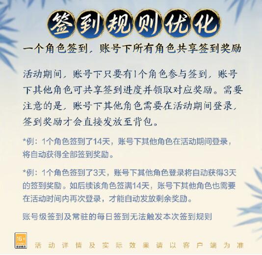 2、活动期间,账号下只要有1个角色参与签到,账号下其他角色可共享签到进度;
