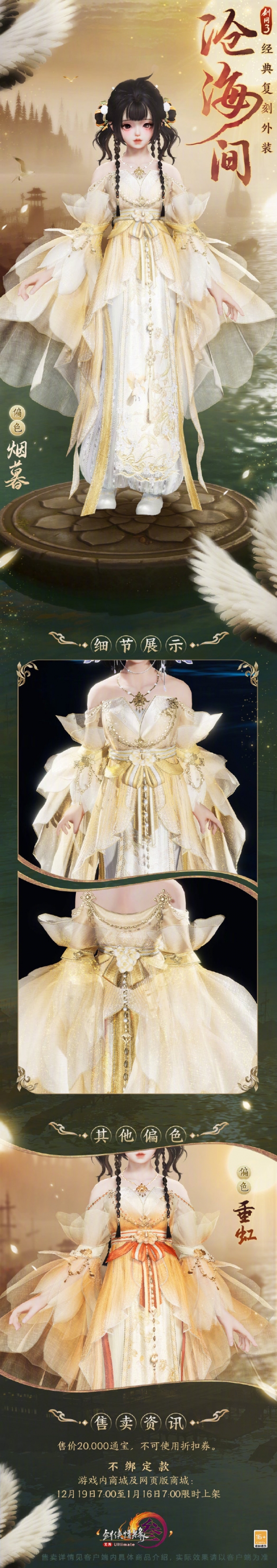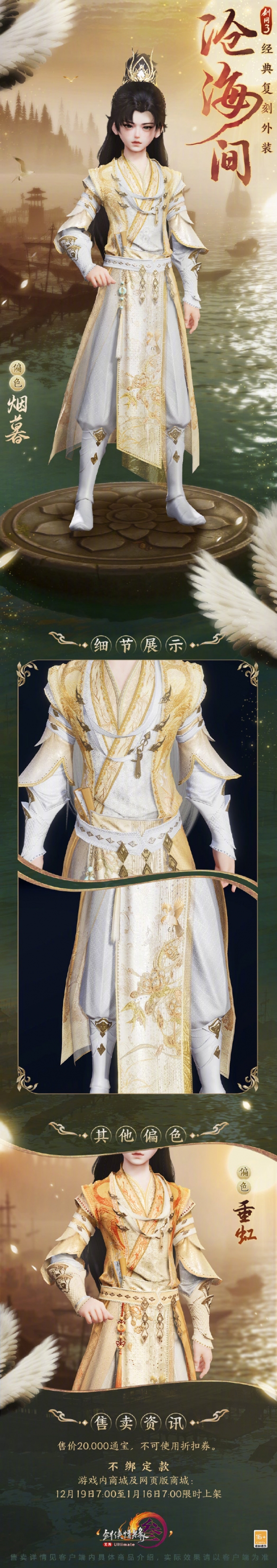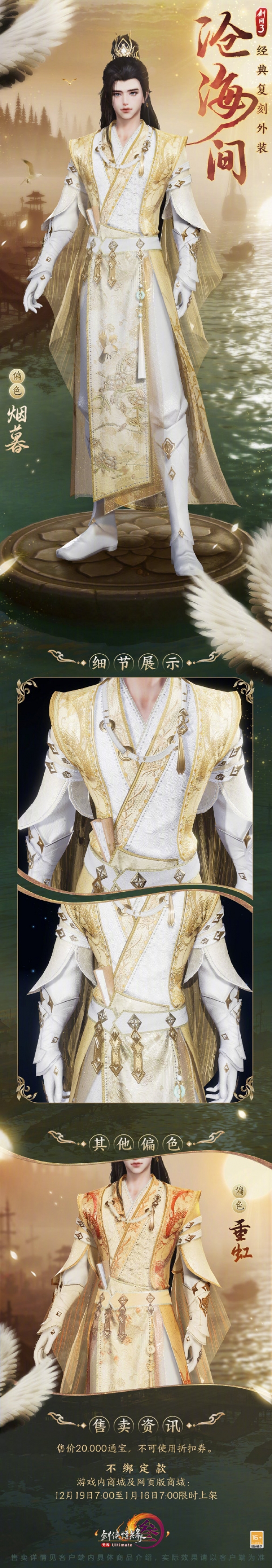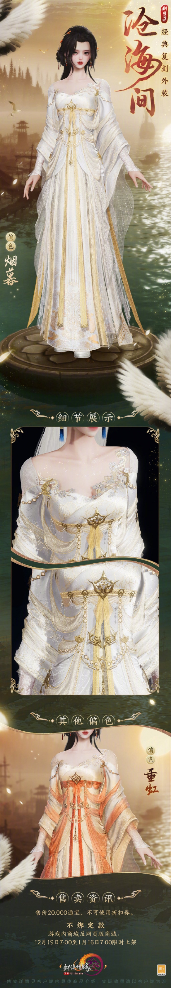 外装沧海间即将复刻,很多玩家想知道外装沧海间长什么样,该外观以白色和黄色为主,还有偏色重红供玩家选择,玩家可以在商城内购买不绑定款,外观售价20000通宝,接下来就由小编给大家带来了详细的《剑网3》外装沧海间外观一览!