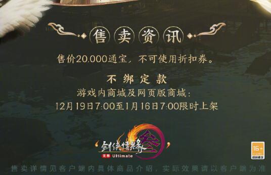 2、玩家可以在商城内购买不绑定款,外观售价20000通宝;