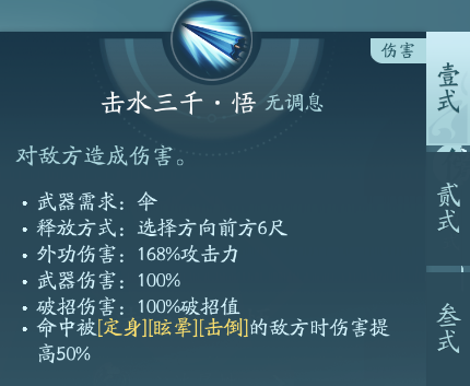 击水三千共有三式,PVP一般不选这个普攻招式,多为PVE使用,【壹式】【贰式】为三次连续伤害,【叁式】在施法动作结束后出伤害。