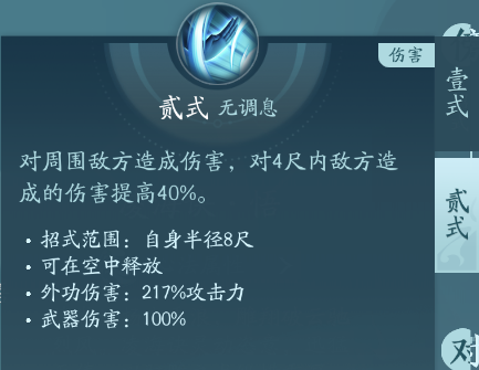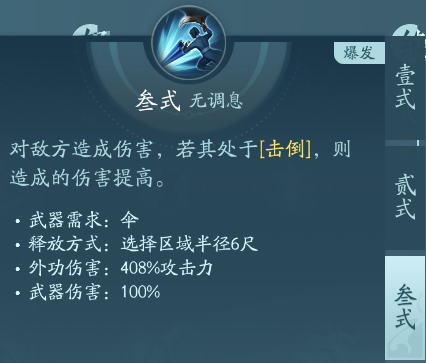 【壹式】施展后,五秒内可施展【贰式】,【贰式】施展后,五秒内可施展【叁式】。技能本身偏pvp,会存在僵直情况。秘章减伤,绝篇增伤。