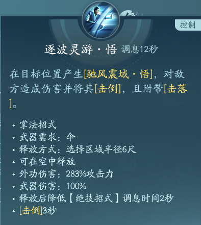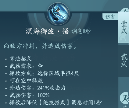 自带必选门派轻功,可在僵直中施展,位移过程中无法施展,在空中也可以使用该技能。
