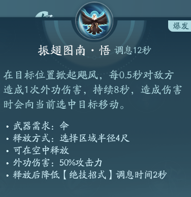 振翅:绝篇秘籍拉人效果,可配合驰风圈限制移动,持续久间隔短。