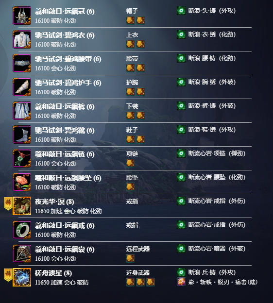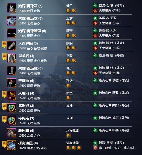 小橙武自带一段加速,在堆会破无+攻击的基础上适当留存几件破招装备即可