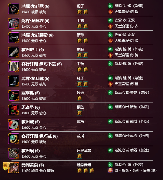 本套装备的亮点是可以达到72的破防和27的会心,在实战中机动性高,伤害能打的更高并且适合平民玩家。