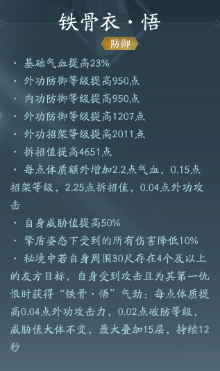 铁骨衣为外功防御门派,根据属性图可知铁骨衣主属性为体质,提高体质可以加气血和外功攻击,配装方面可以通过堆体质来增加血量和防御。