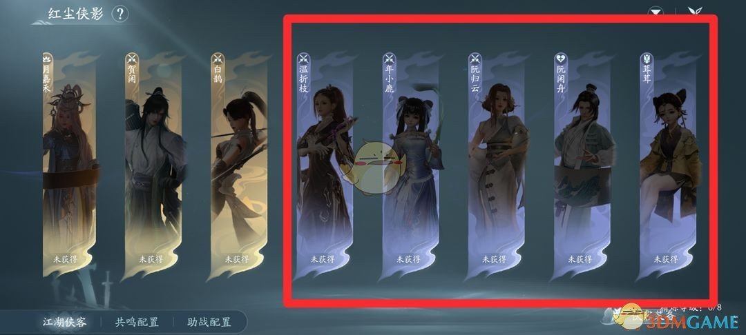 2、如下图所示的范围内侠客是可以被雇佣的,金色区域的侠客是助战侠客。