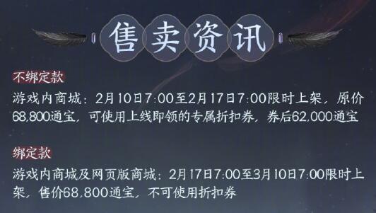 2、绑定款不可使用折扣券,售价68.800通宝,不绑定款使用专属折扣券,券后62.000通宝;
