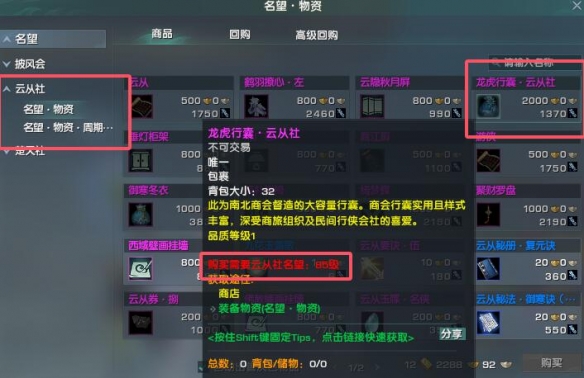 云从社声望商店,购买即可获得32格【龙虎行囊】。