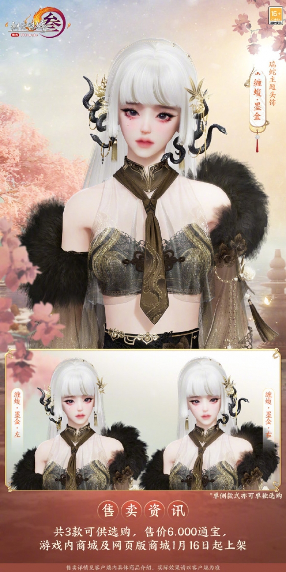 新春蛇年主题头饰缠蝮即将上线,很多玩家想知道头饰缠蝮外观长什么样,头饰有两种偏色,颜色一白金和墨金为主,每个偏色都有头饰左右侧及两侧一体共3款可以选择,接下来就由小编给大家带来了详细的《剑网3》瑞蛇主题头饰缠蝮外观一览!