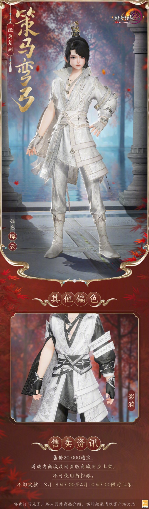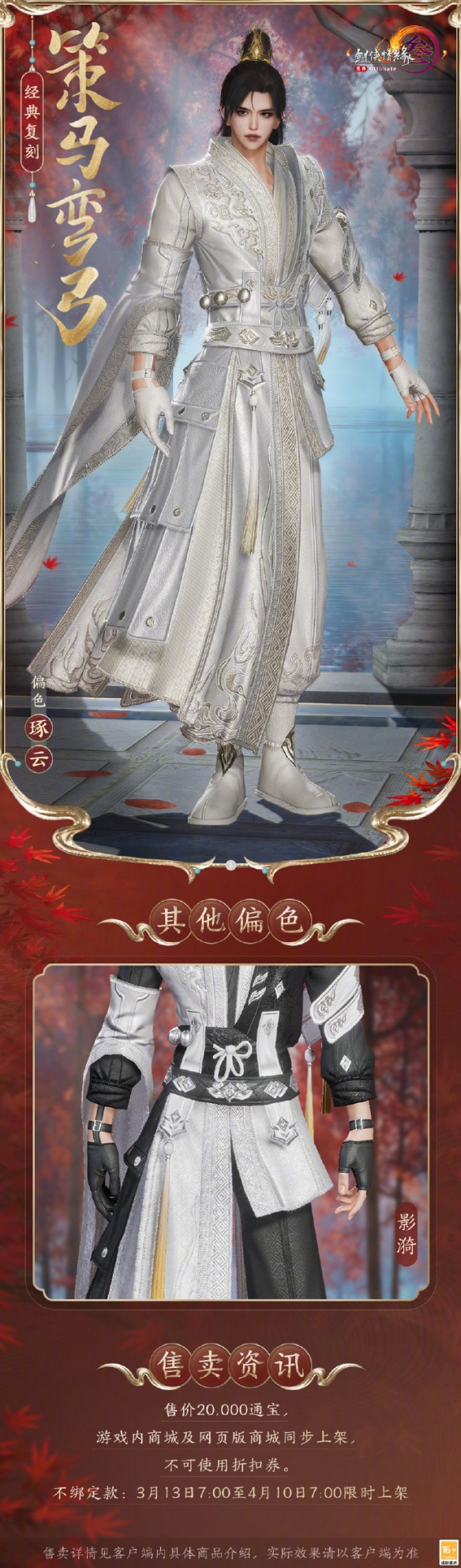 剑网3外装策马弯弓会和云霆外装一起复刻,很多玩家想知道该外观长什么样呢,外装有黑白色和白金色两种可选择,时装售价为20.000通宝,不支持玩家使用折扣券,接下来就由小编给大家带来了详细的《剑网3》经典复刻外装策马弯弓外观一览!