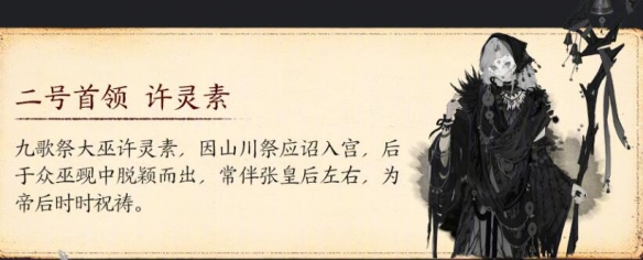 九歌祭大巫许灵素,因山川祭应诏入宫,后于众巫觋中脱颖而出,常伴张皇后左右,为帝后时时祝祷。